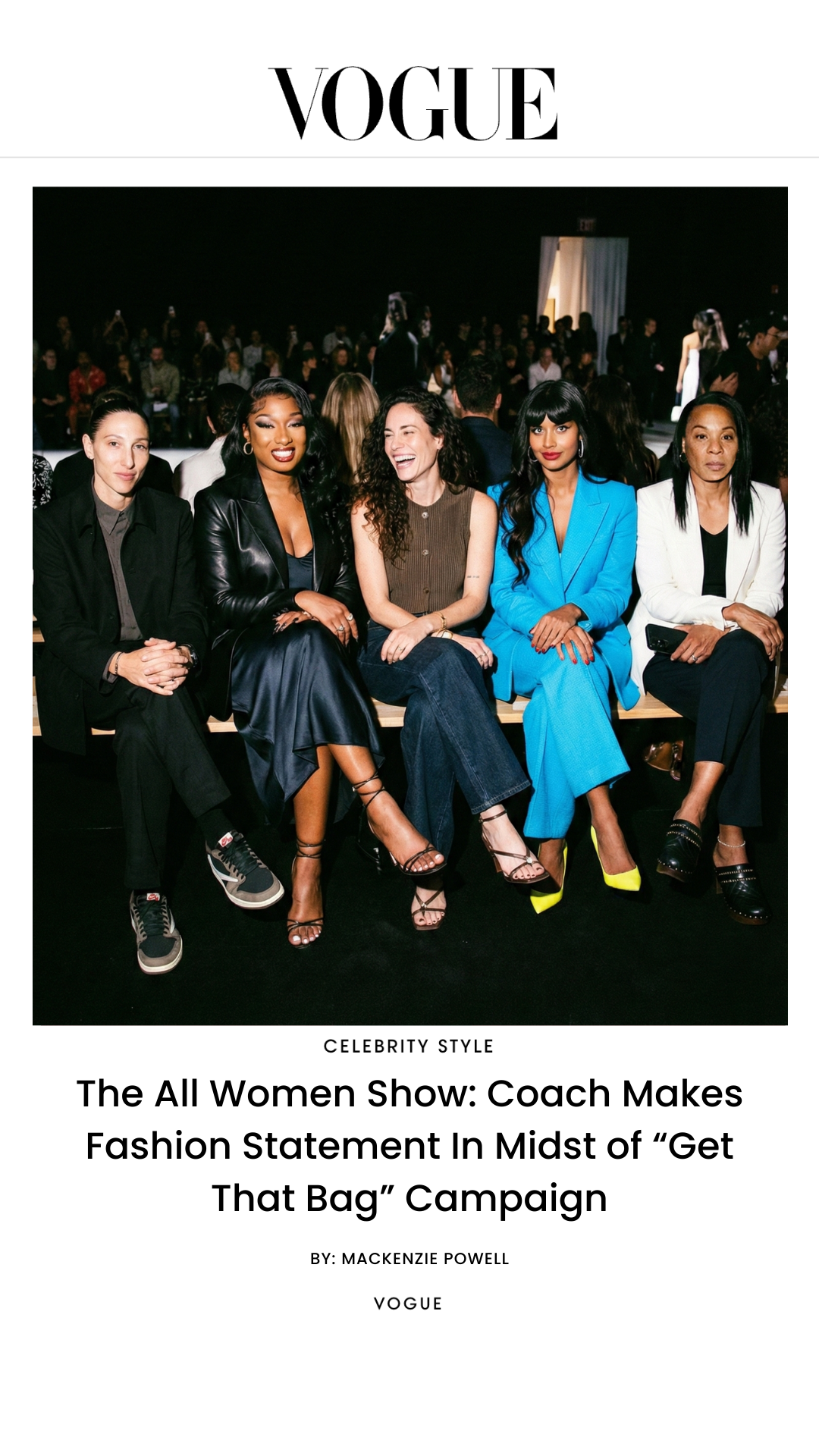 The guest list is exclusively women that have been outspoken about equity for their fellow girls. Our front row features Diana Taurasi, Megan Thee Stallion, Sue Bird, Jameela Jamil, and Dawn Staley.