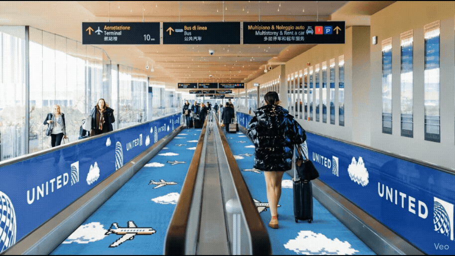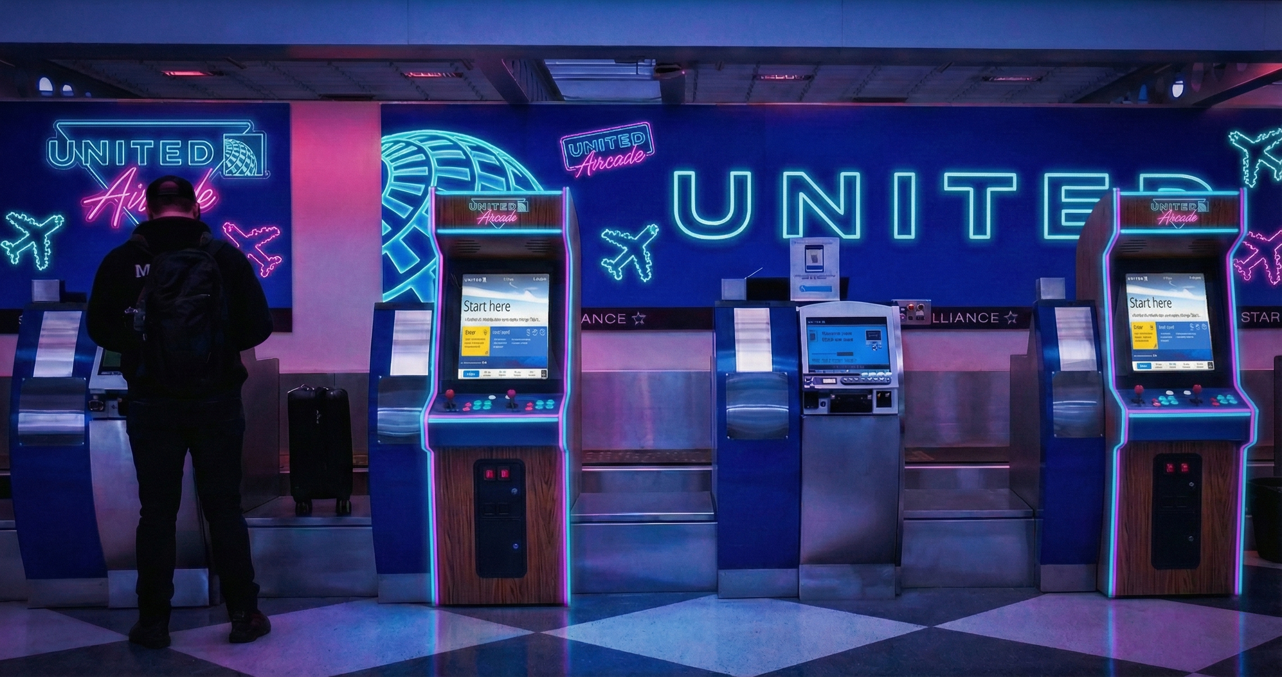 The United ticket desk sets the tone with an 8-bit makeover. Passengers set their own gamertag when they check in.