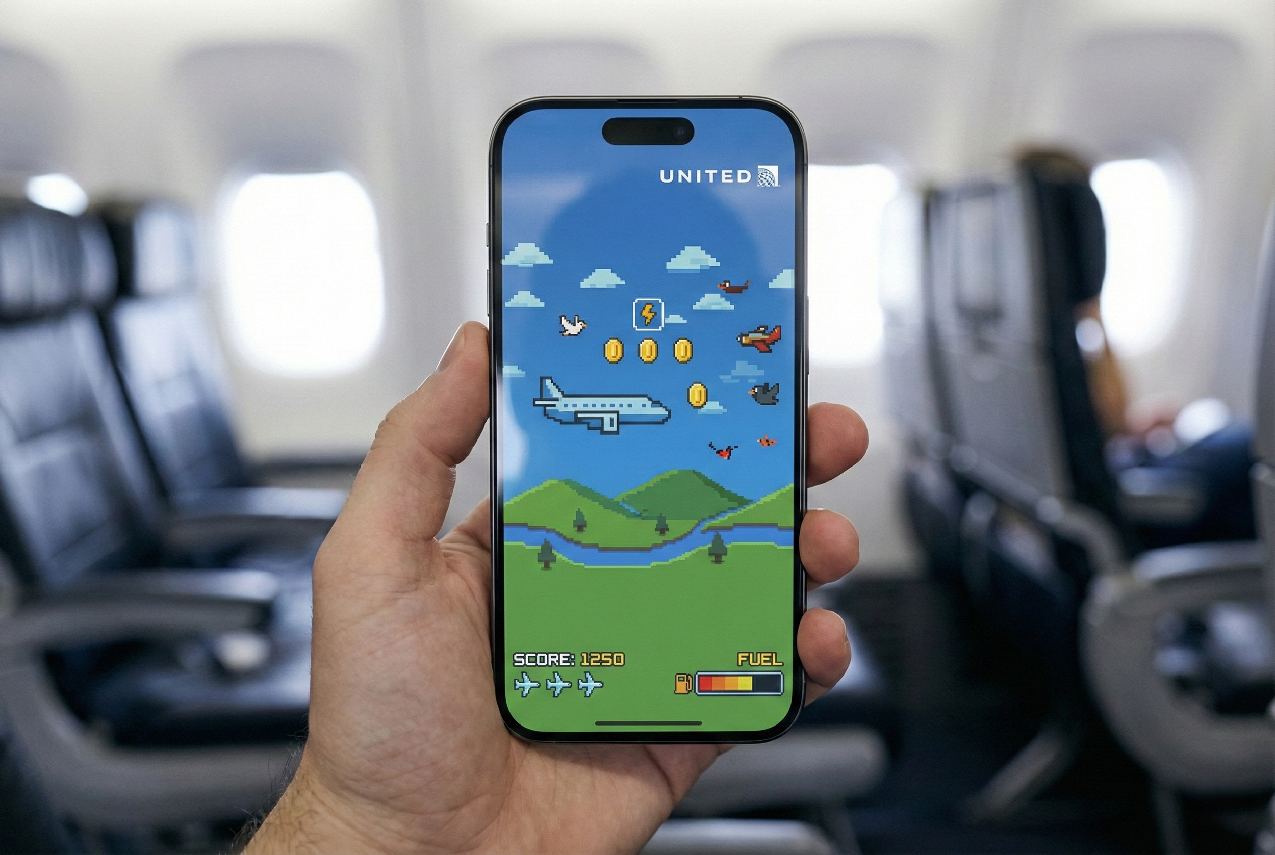 Pilot Mode allows passengers to play by themselves and rack up points for real-life benefits. Possible prizes include a free snack pack, complimentary drink, early boarding on your next flight, one-time United lounge access, and super rad merch.